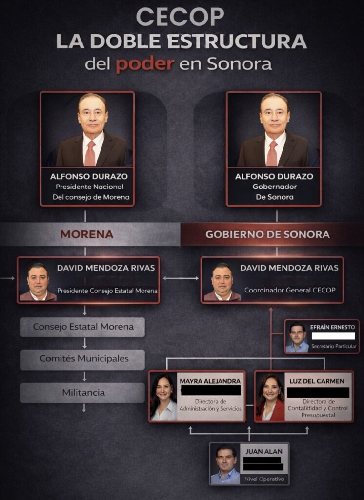 Para comprender la complejidad del caso relacionado con el Consejo Estatal de Concertación para la Obra Pública (CECOP) y su posible vínculo con la estructura partidista de Morena en Sonora, Reportero H elaboró un organigrama explicativo que busca facilitar la lectura pública de cómo operaban —al menos en términos políticos y administrativos— los distintos niveles de decisión.